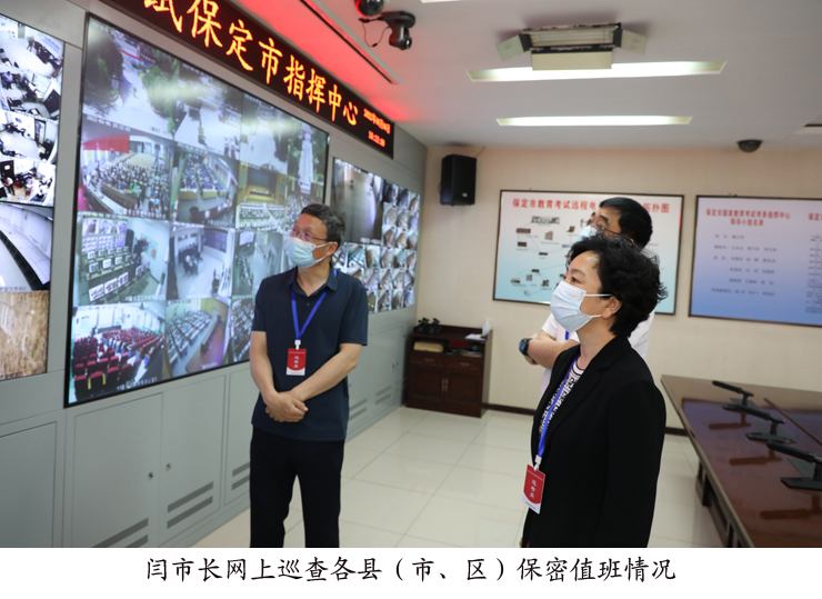 在市教育考試院考試指揮中心,閆市長一行實地檢查了試卷保密室和考試指揮巡查平臺。閆市長親切慰問了參加試卷安保值班的武警戰(zhàn)士、公安干警和考試院工作人員;通過視頻監(jiān)控系統(tǒng),重點查看了隔離考場設(shè)置情況、各縣(市、區(qū))試卷保密值班和各考點考場設(shè)置情況,要求各單位在當(dāng)前疫情防控形勢下,強(qiáng)化責(zé)任意識,嚴(yán)格操作、規(guī)范管理,以最高標(biāo)準(zhǔn)、最細(xì)措施,全力做好高考期間考試組織、服務(wù)保障和疫情防控工作。