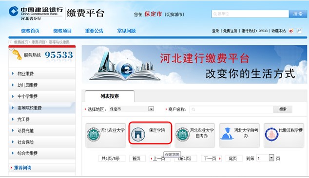 進(jìn)入“建設(shè)銀行河北省分行”微信公眾號(hào),點(diǎn)擊“悅生活”菜單后,依次選擇相應(yīng)的“微繳費(fèi)------高等院校繳費(fèi)”,地區(qū)從下拉菜單選擇“保定市”,通過搜索單位,然后選擇“保定學(xué)院”圖標(biāo)進(jìn)入。