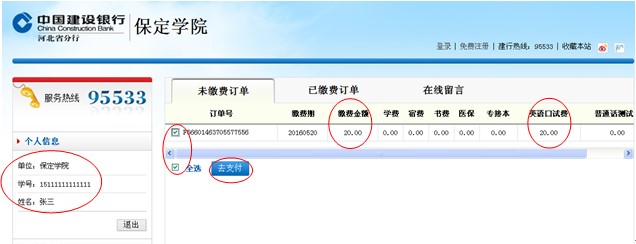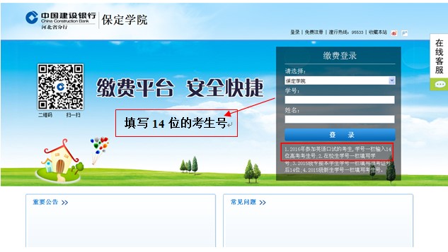 2017年擬參加英語口試的考生,須在6月1日至5日通過關(guān)注“建設(shè)銀行河北省分行”微信公眾號(hào)或登錄河北建設(shè)銀行繳費(fèi)平臺(tái)(http://www.ccbjf.com)繳納口試費(fèi)20元(具體繳費(fèi)說明詳見附件)。此繳費(fèi)方式可使用任意一家有銀聯(lián)標(biāo)志的銀行卡(建議使用建行卡支付,暫不支持信用卡支付)。