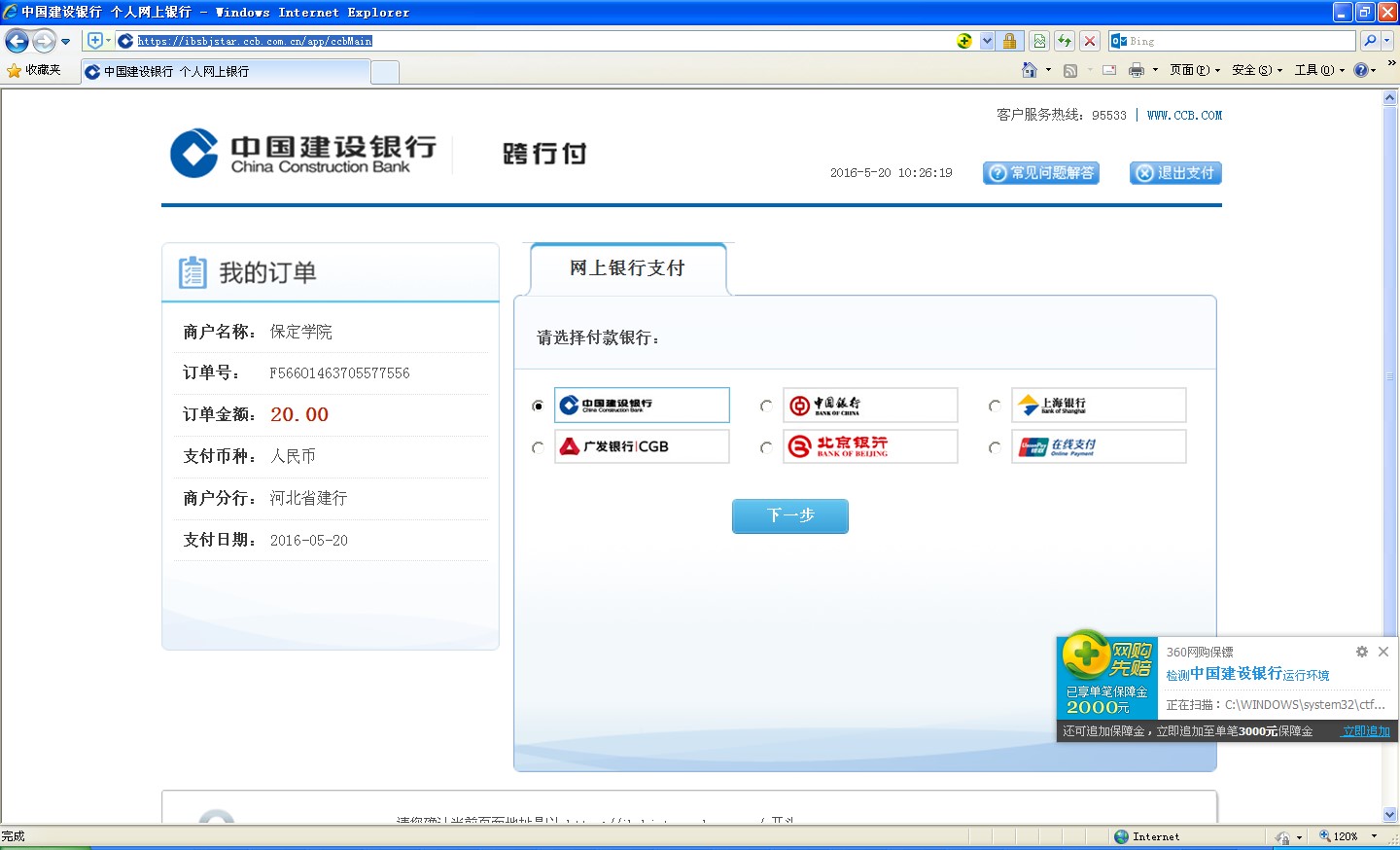再次確認(rèn)賬單,點(diǎn)擊“去支付”按鈕。進(jìn)入網(wǎng)上銀行支付“付款銀行”選擇界面。