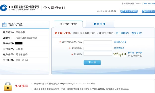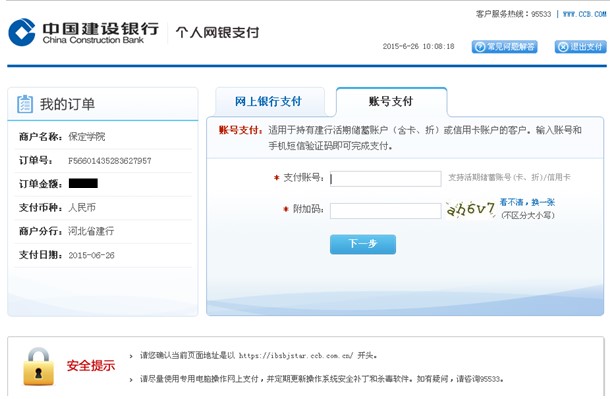 完成以上操作后,點(diǎn)擊“下一步”,頁面顯示建設(shè)銀行支付界面,此時(shí)提供兩種方式支付:網(wǎng)上銀行支付和賬號(hào)支付。已辦理建行網(wǎng)銀業(yè)務(wù)的可用兩種方式繳費(fèi),未辦理建行網(wǎng)銀業(yè)務(wù)的只可用賬號(hào)支付繳費(fèi)。