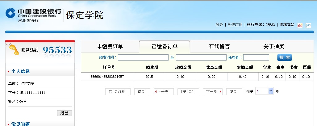 點(diǎn)擊已繳費(fèi)訂單按鈕,可以查詢您的所有繳費(fèi)記錄。
