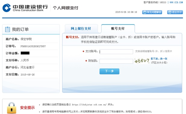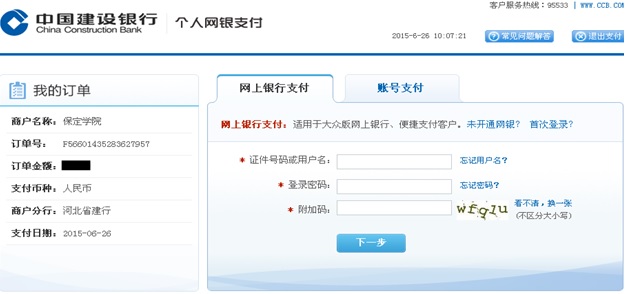 完成以上操作后,點(diǎn)擊“下一步”,頁面顯示建設(shè)銀行支付界面,此時(shí)提供兩種方式支付:網(wǎng)上銀行支付和賬號(hào)支付。已辦理建行網(wǎng)銀業(yè)務(wù)的可用兩種方式繳費(fèi),未辦理建行網(wǎng)銀業(yè)務(wù)的只可用賬號(hào)支付繳費(fèi)。