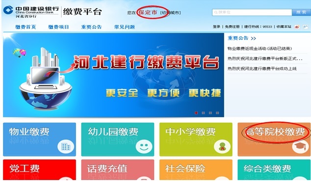 進(jìn)入“建設(shè)銀行河北省分行”微信公眾號(hào),點(diǎn)擊“悅生活”菜單后,依次選擇相應(yīng)的“微繳費(fèi)------高等院校繳費(fèi)”,地區(qū)從下拉菜單選擇“保定市”,通過搜索單位,然后選擇“保定學(xué)院”圖標(biāo)進(jìn)入。