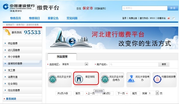 2、選擇所繳費(fèi)用商戶的類別---高等院校繳費(fèi),然后點(diǎn)擊相應(yīng)的圖標(biāo)---“保定學(xué)院”,進(jìn)入“繳費(fèi)登錄”頁面。