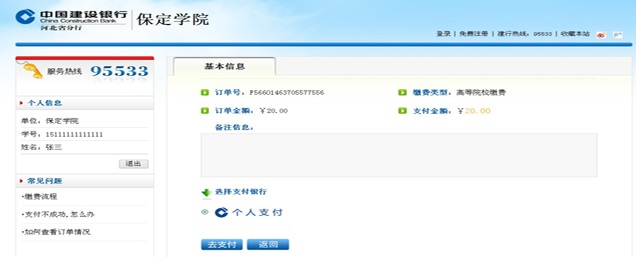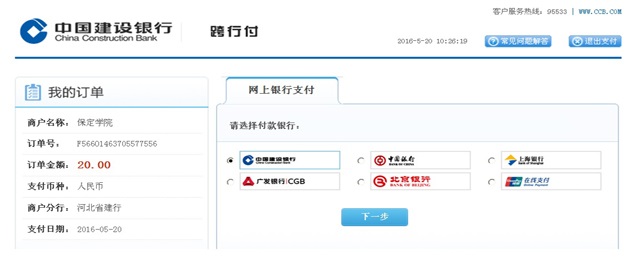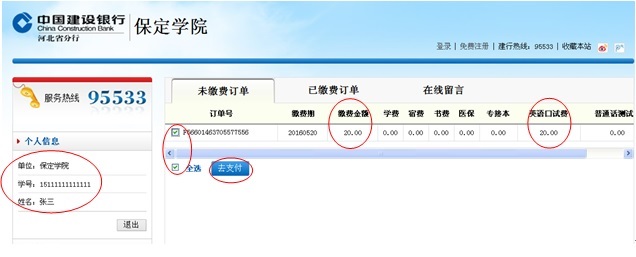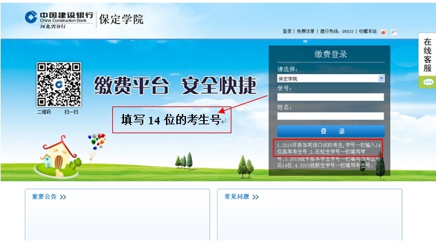 擬參加2018年英語口試的考生,須于6月1日至5日通過關(guān)注“建設(shè)銀行河北省分行”微信公眾號(hào)或登錄河北建設(shè)銀行繳費(fèi)平臺(tái)(http://www.ccbjf.com)繳納口試費(fèi)20元(具體繳費(fèi)說明詳見附件)。此繳費(fèi)方式可使用任意一家有銀聯(lián)標(biāo)志的銀行卡(建議使用建行卡支付,暫不支持信用卡支付)。逾期未交費(fèi)考生視為自動(dòng)放棄英語口試。繳費(fèi)咨詢電話:0312-2036301(建行)、0312-5972089(保定學(xué)院財(cái)務(wù)處)。